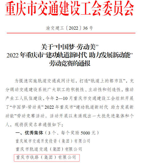 近日,重庆市交通建设工会对“建功轨道新时代 助力发展新动能”劳动竞赛的优秀集体、班组和个人进行了表彰,市铁路集团荣获“优秀集体”,城轨快线15号线项目部、27号线项目部获“优秀班组”,6人分别获得“优秀个人”“优秀组织奖(个人)”。
